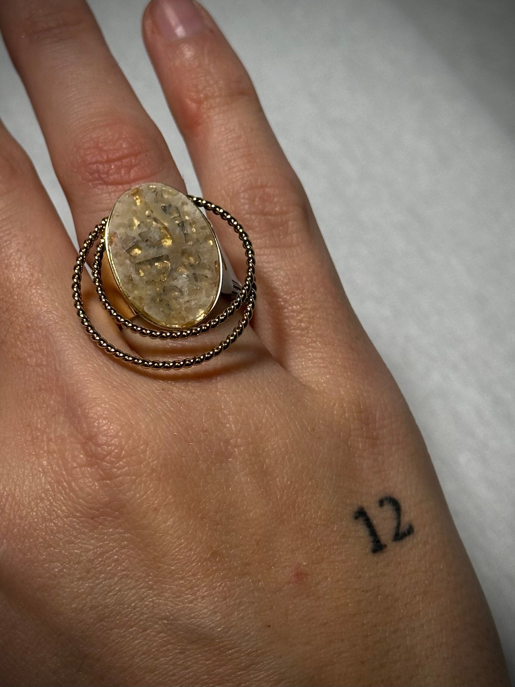 Deze stenen ring is extra bijzonder door de 2 gedraaide ringen om de steen heen. Een prachtig item voor in jouw collectie!