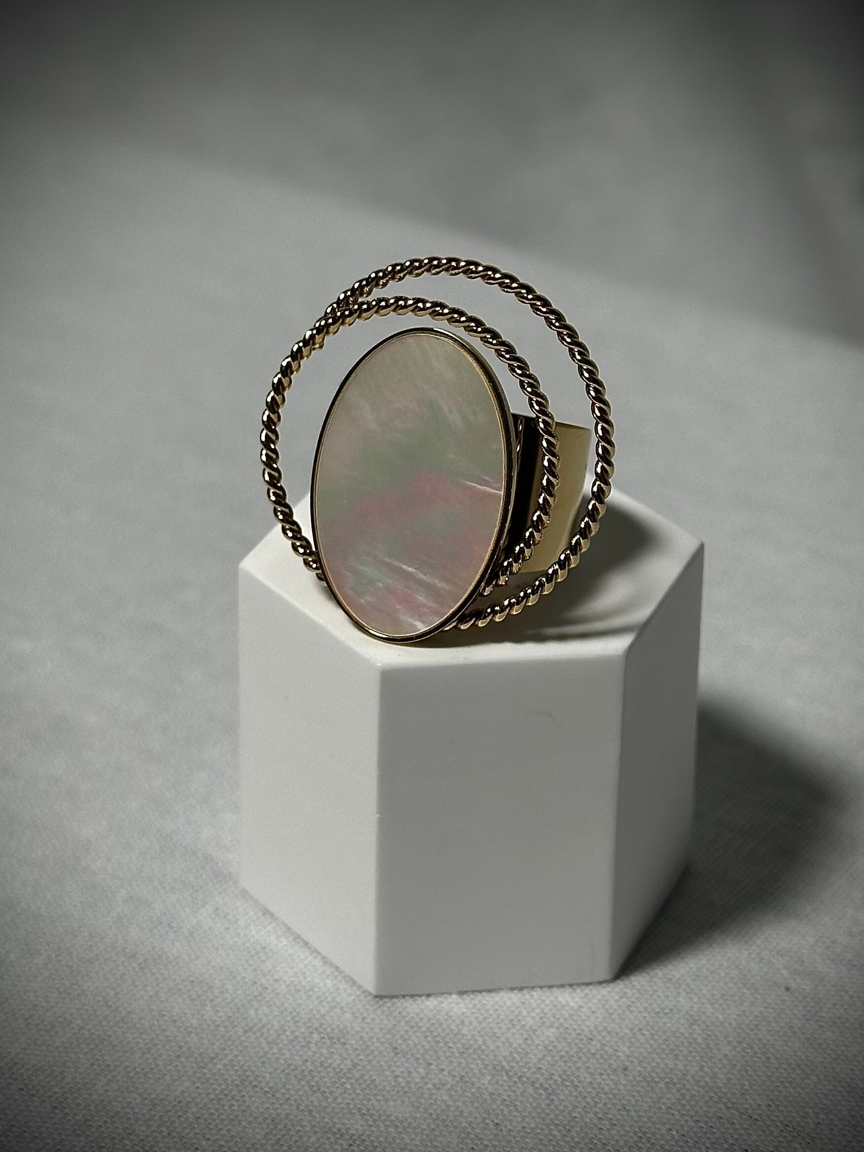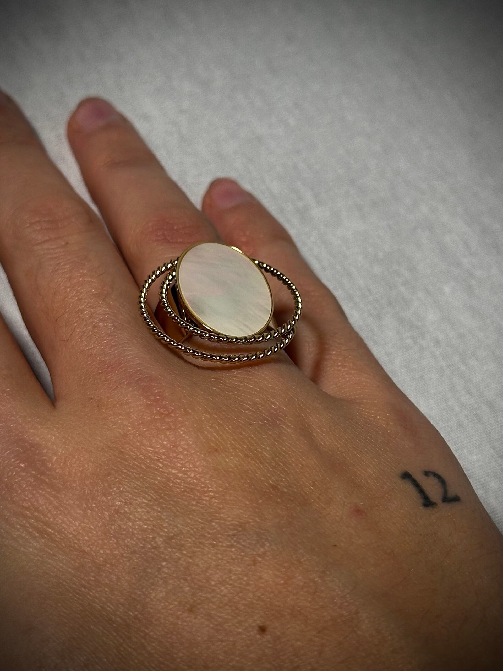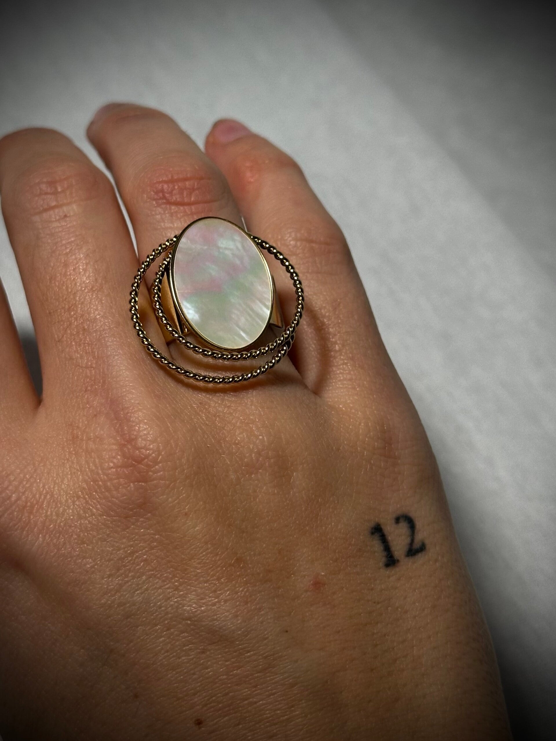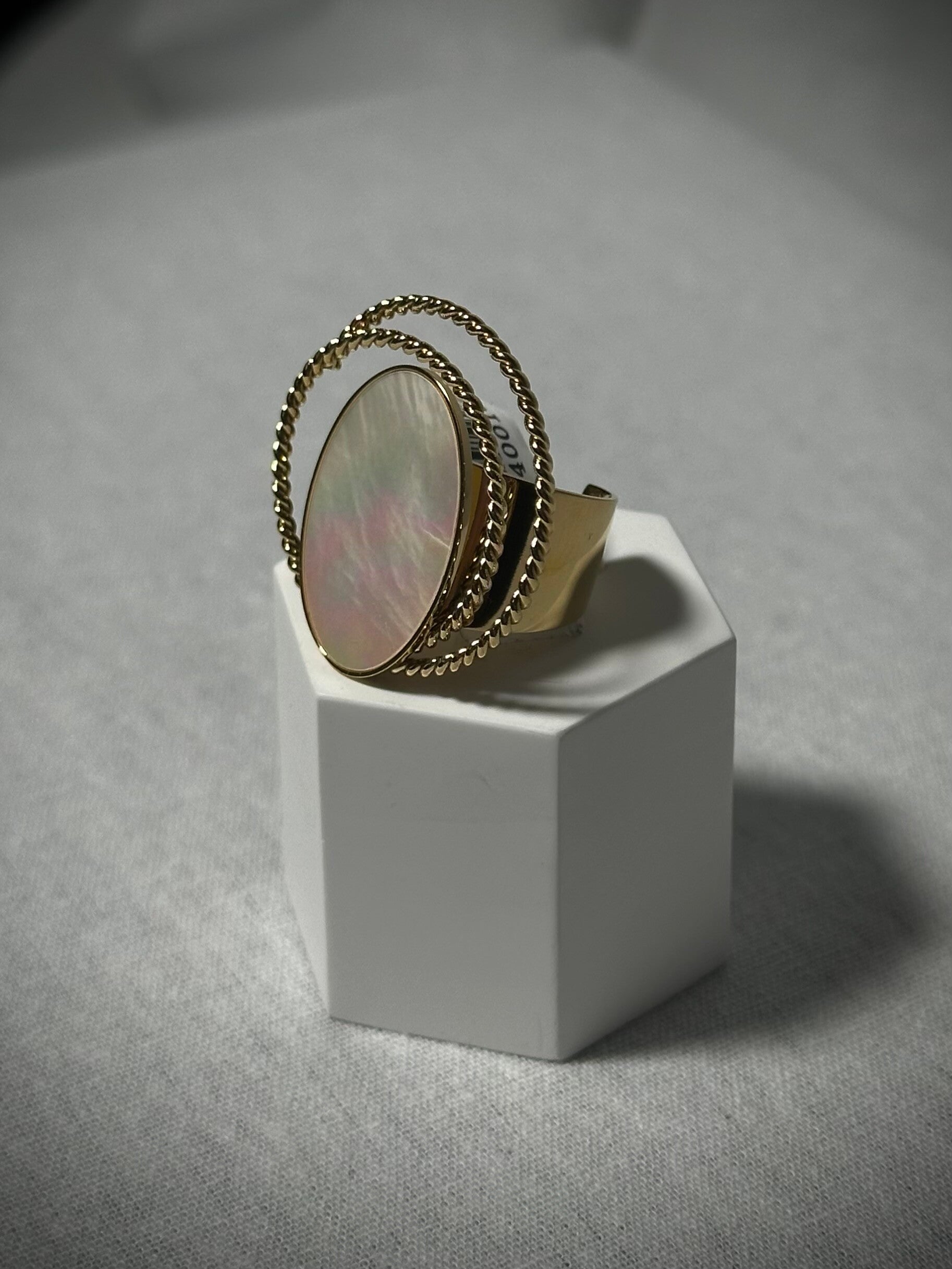 Deze ring is een prachtig item omdat de steen parelmoer achtig is en daaromheen zitten nog 2 ringen. Een echt statement piece!